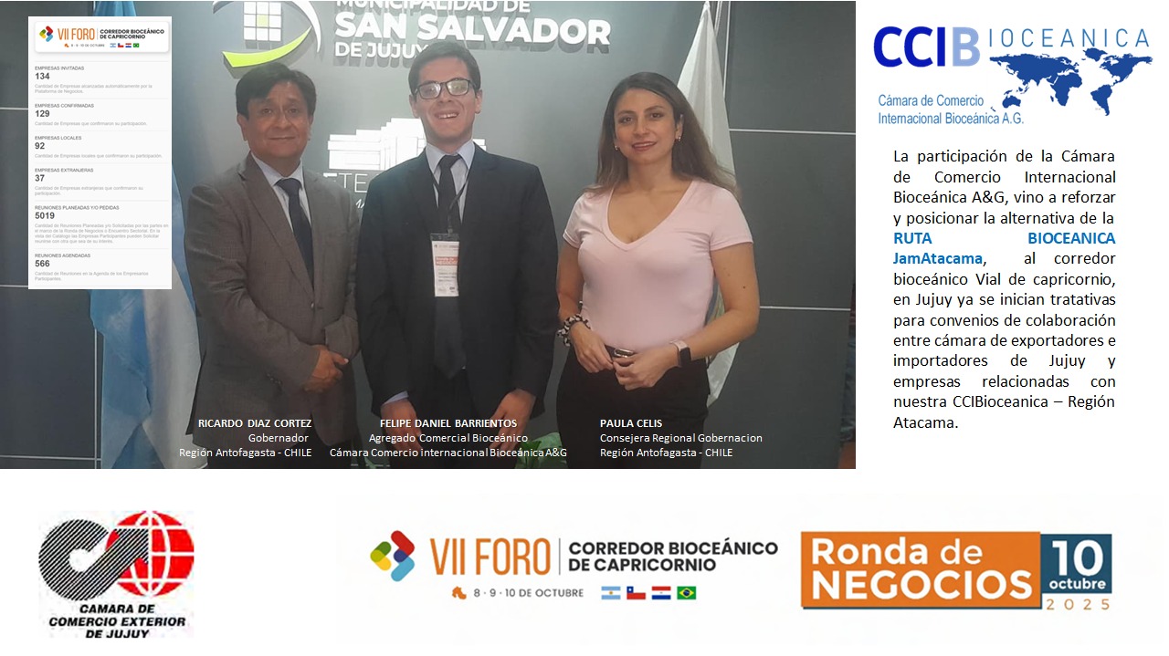 La Cámara de Comercio Internacional Bioceánica A&G (CCIBioceánica), constituida en el año 2018 en la Región de Atacama, Chile, bajo el Registro N° 131-3-2018, se encuentra en pleno proceso de implementación y ejecución de sus lineamientos estratégicos. Nuestra misión es fomentar y promover la habilitación y uso de los pasos fronterizos que conforman los corredores bioceánicos, incentivar la gestión territorial de nuestras empresas miembros, facilitar la integración comercial bilateral y multilateral, y promover el desarrollo social, ambientalmente sostenible y comercialmente aceptable de nuestros asociados